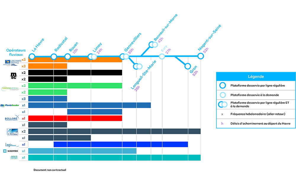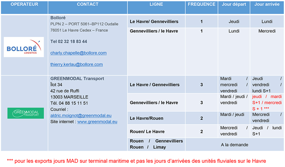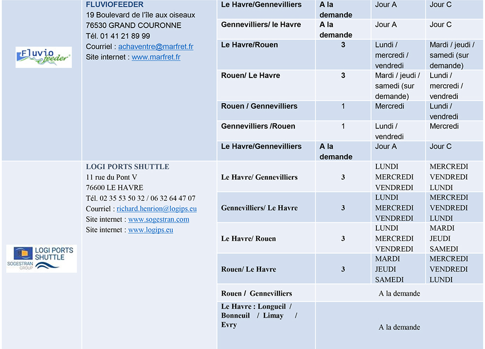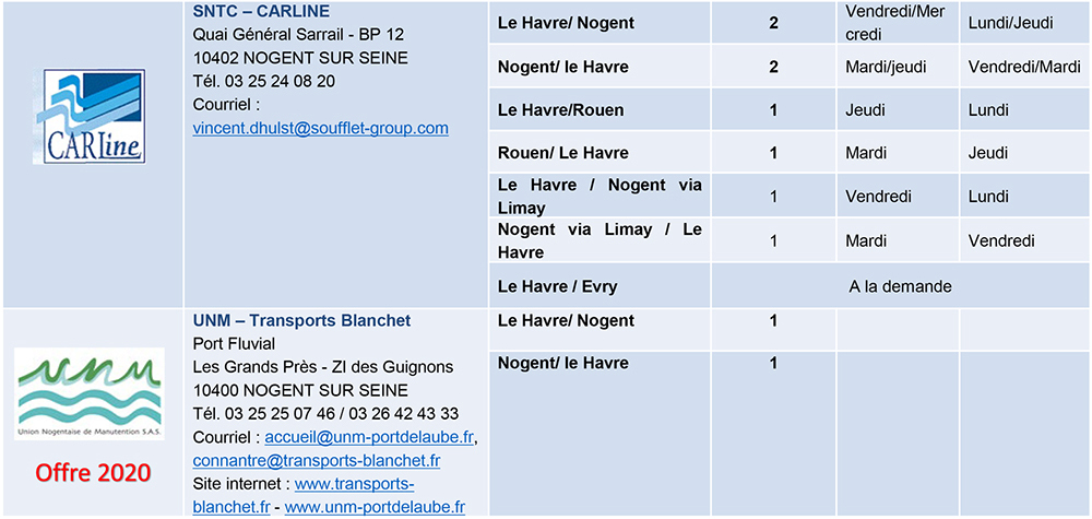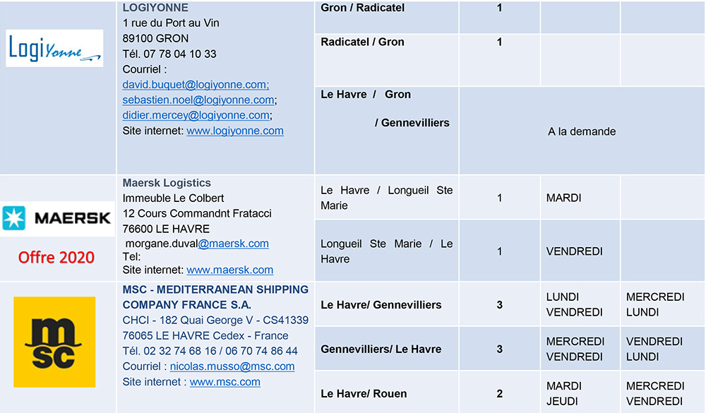Bolloré Logistics, Greenmodal Transport, Fluviofeeder, Logi Ports Shuttle, LogiYonne, Maersk Logistics, MSC, SNTC – Carline, UNM - Transports Blanchet